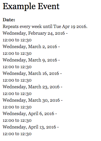 By default, a repeating date will display all instances on the node display as demonstrated below. This creates a cluttered display, and is also not helpful once an instance is over.