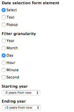For Date selection form element, Filter granularity and ** Starting year** you can use the default settings