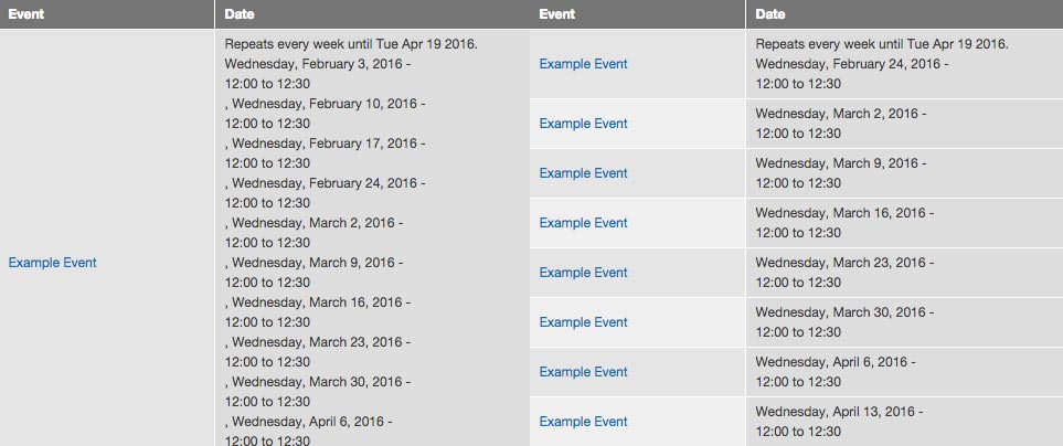 You’ll notice that if you create a view that displays repeating dates, the view can become overwhelming quickly as demonstrated below.