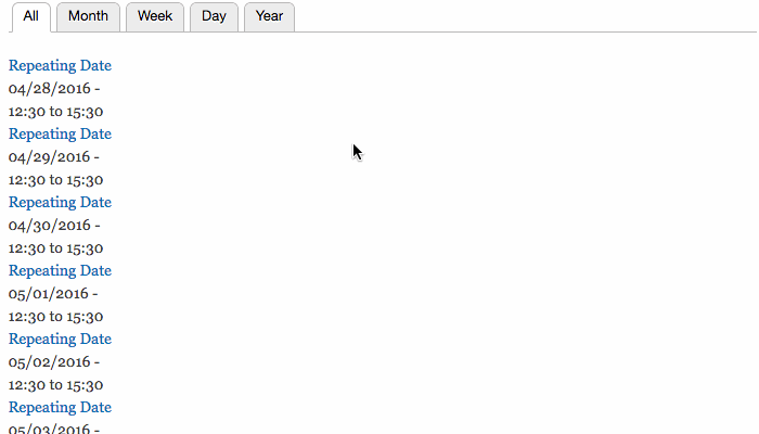 Drupal’s Calendar module allows an easy way for site builders to display events in a month, week day and year format right out of the box. However, I recently needed to add an additional tab to the view display to list all upcoming events. The requirements were that this would become the default display for the view, meaning that the list would display be default if user didn’t supply any arguments to the URL. For example, if the user navigated to example.com/events they would see the list of all upcoming events instead of the month view. In order to follow along in this tutorial you will need a content type that is using a Date field with an end date. You will also need the Calendar module installed.